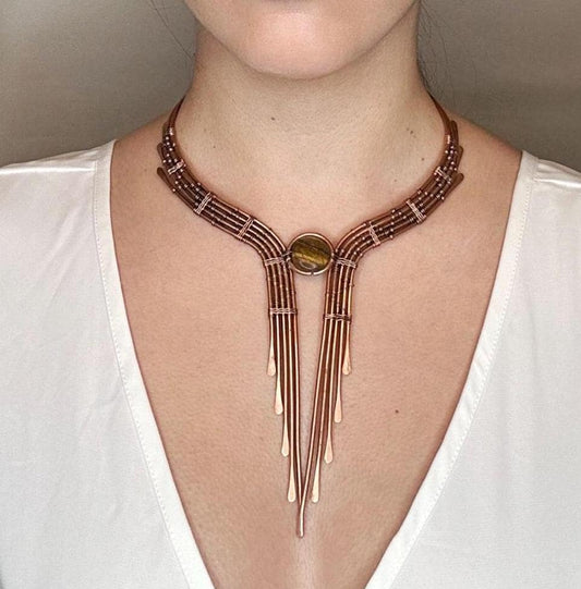 Collar de inspiración egipcia de alambre de cobre con crisocolas